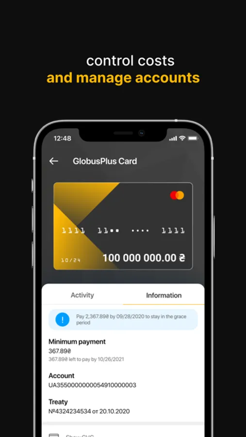 GlobusPlus is a banking mobile application with simple and clear financial functions. With the help of the application, you can become a client of Globus Bank without leaving your home. The process is easier than you can imagine and takes only a few minutes. After registration, the following functions will be immediately available to you:
