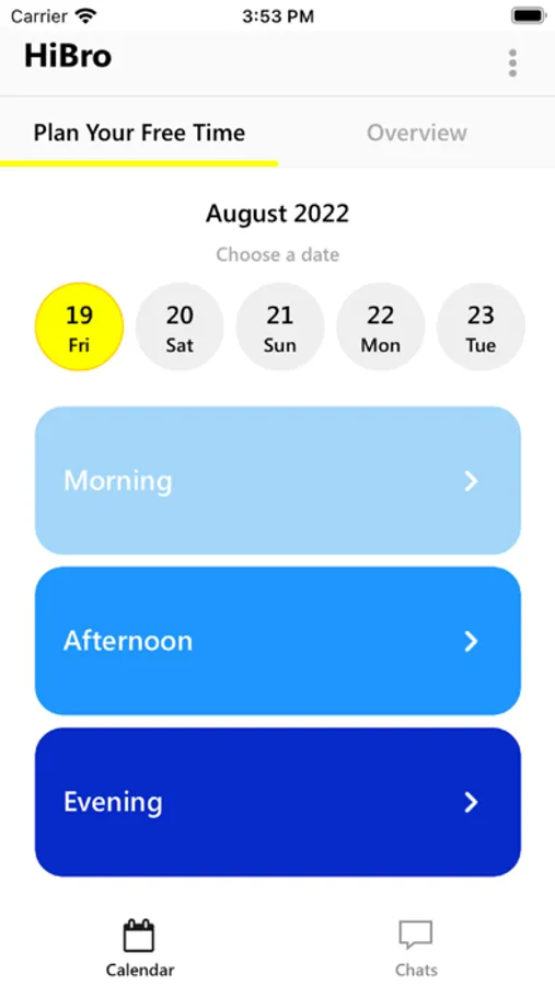 HiBro allows you to choose a time of a day (morning, afternoon, evening) up to 14 days into the future when you would like to meet up with friends. Then you can choose one or more of your friends from your contact list with whom you would like to meet up. If one of your friends has done the same, there will be a «Meet». Since you already know with whom and at what time you will meet, the concrete content of the meeting can be agreed upon quickly in the chat. As you can see, HiBro is the newest and coolest tool around to effortlessly socialize and meet up with your friends.