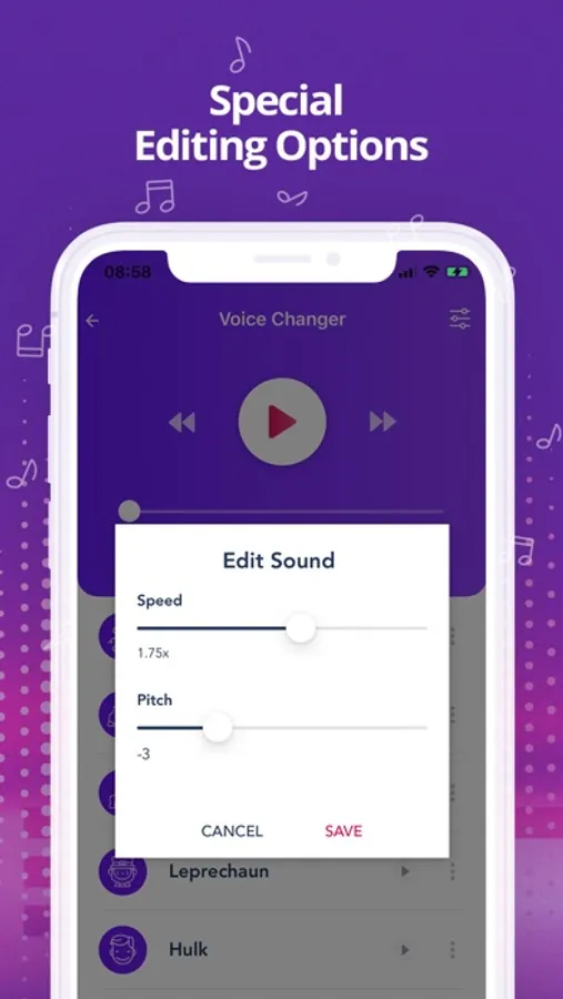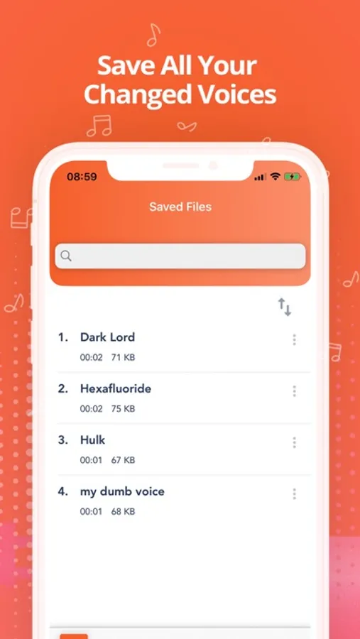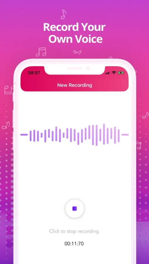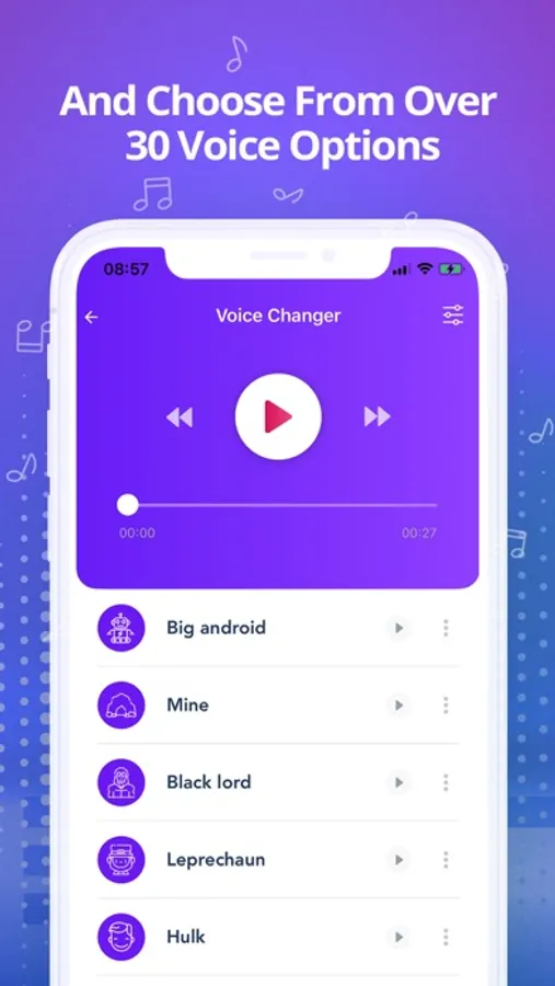 Using this voice changer is easy. You can record your voice or upload a file. When you are done recording, use our voice generator for altering your voice in over 30 ways (robot voice, kids voice, helium, voice box, etc.) and save your recording. Then, browse through your library of new voices and share them with only a tap.