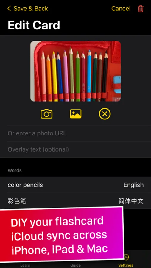 The process of creating your own flashcard is very important -- from deciding on what to learn, to choosing a picture, to typing out the word -- because it helps to form deeper connections. As scientific research has shown, a personal connection will retain memory by 2x!