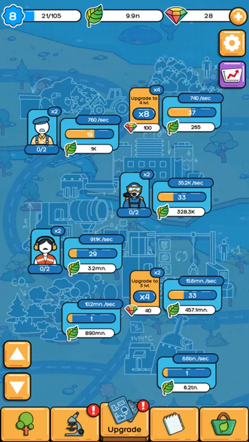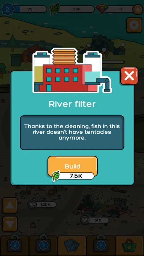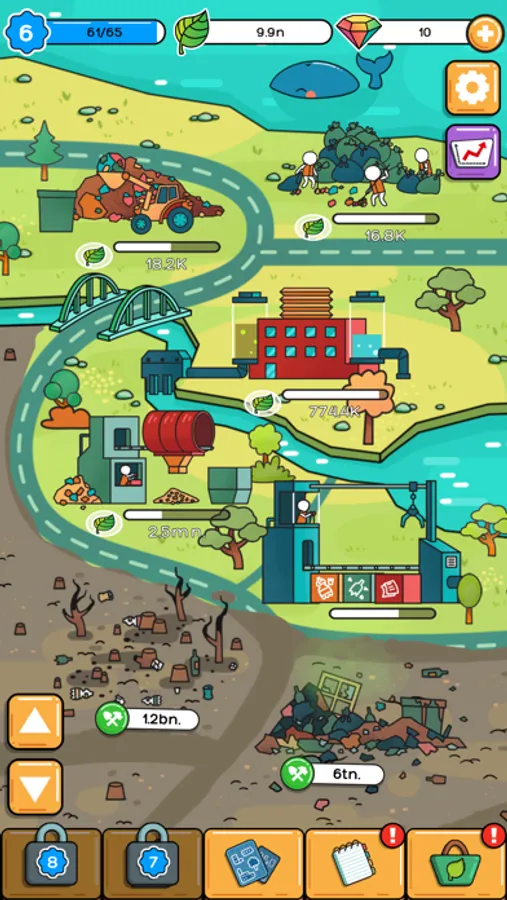 Hire more workers, buy heavy equipment and build recycling facilities to process various garbage faster and produce pure energy! Pure energy is the most valuable currency in our game. Upgrade your treatment facilities to earn the energy faster and learn new ways to process waste.