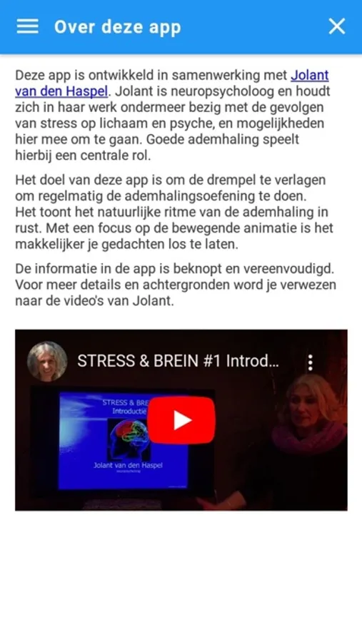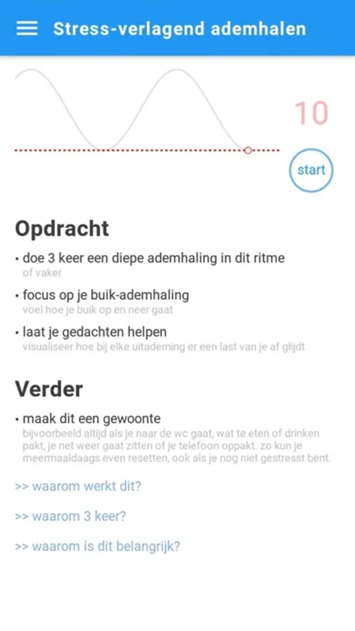 Tevens bevat de app een uitleg waarom ademhaling hiervoor werkt en waarom ontstressen belangrijk is voor je lichaam en welzijn.