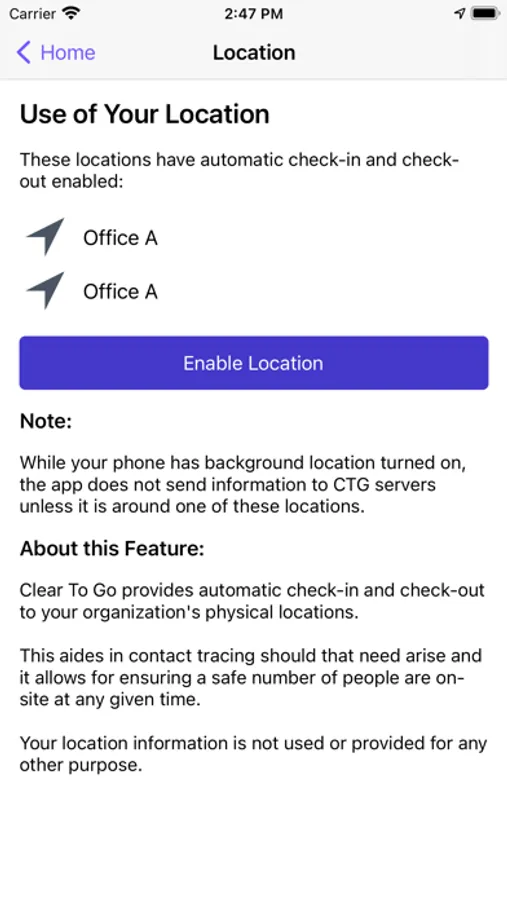 The CLEAR TO GO!™ App connects with the CTG enterprise service for managing entry and safe usage of commercial facilities by presenting a series of questions deemed necessary by the facility to comply with federal, state and local guidelines as directed by the facility's legal & compliance team.