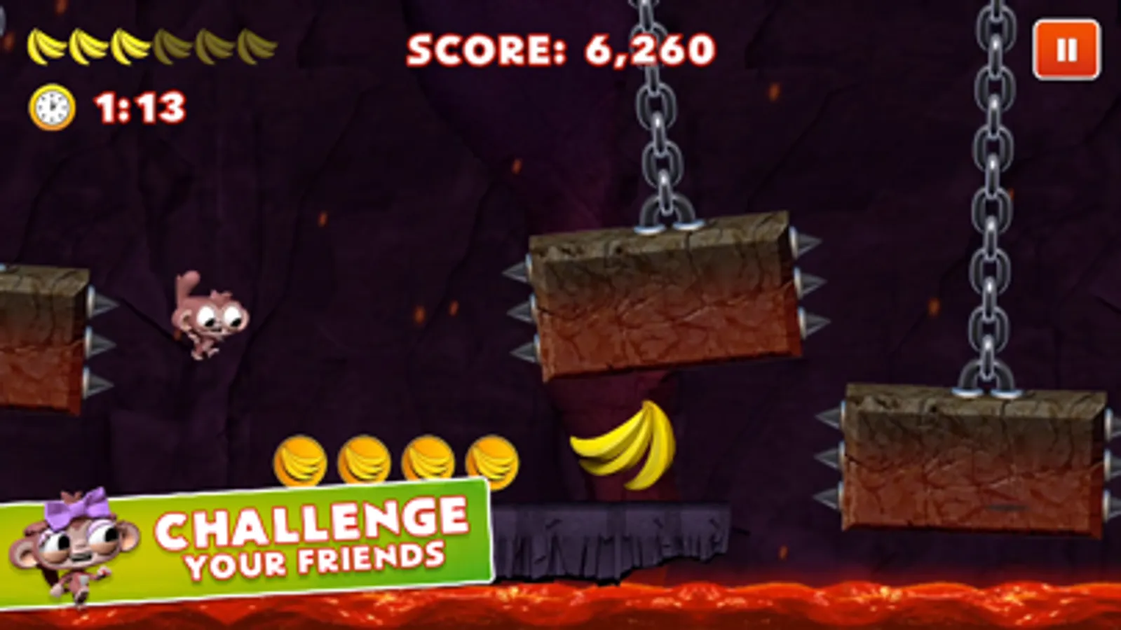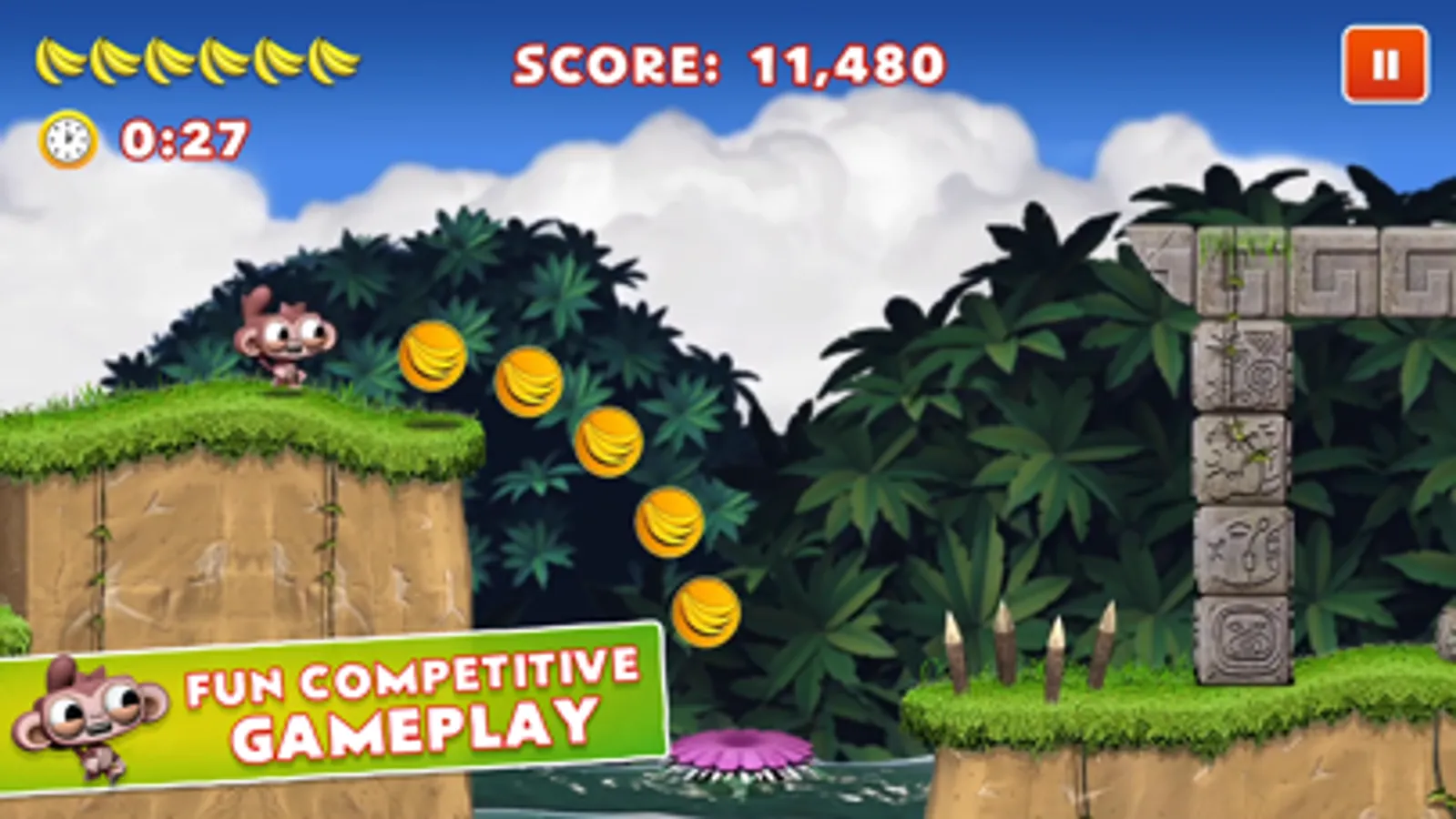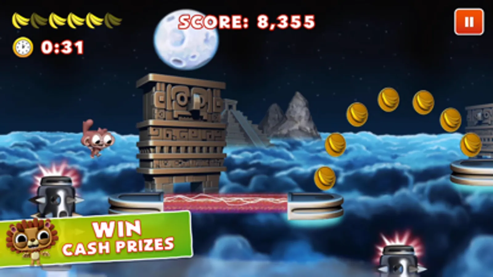 Welcome to Dare the Monkey, a super casual, one-touch platformer where you can win cash prizes (where available) against online opponents. Grab as many coins and bananas as possible to outscore your rival. Beat the clock and travel as far as possible to earn huge bonuses across several amazing locations.
