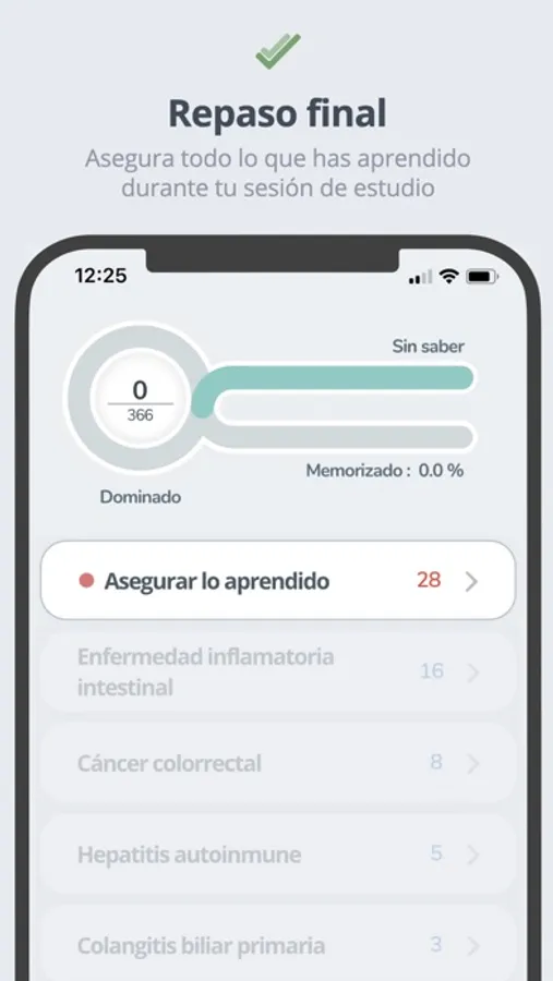 FlashMed es la forma más eficaz y sencilla de estudiar Medicina. Siempre en tu bolsillo, te servirá tanto si necesitas preparar una asignatura, como si tienes que aprenderte toda una oposición. Dentro vas a encontrar todos los conceptos triturados en forma de preguntas y respuestas simples y fáciles de memorizar al instante. Además, podrás estudiar aumentando progresivamente la dificultad: así conseguirás asentar primero las bases para después ir aprendiendo datos más específicos.