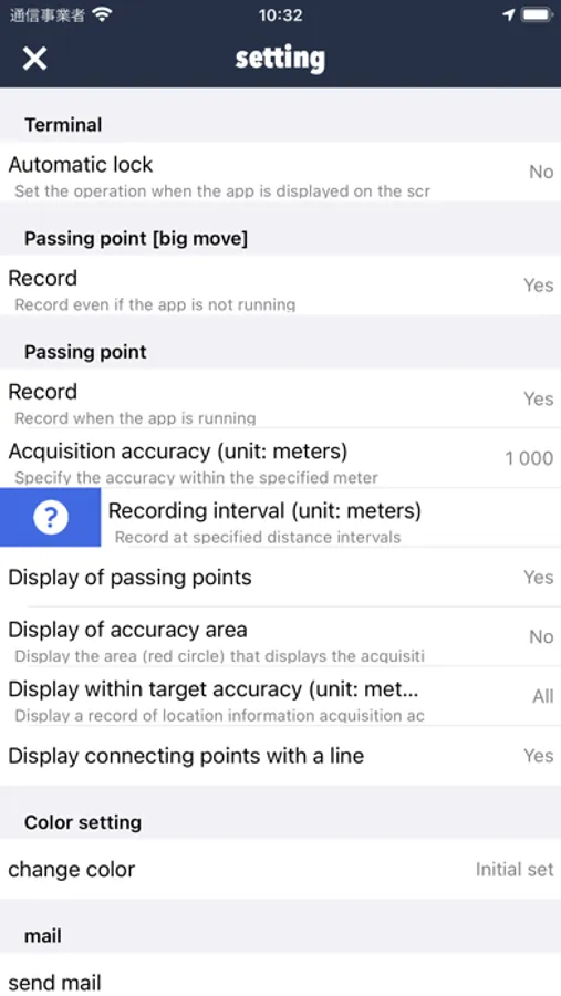 * The "staying place" and "passing point [major move]" are recorded when the app is not running. However, it consumes less power, although it can be less accurate.