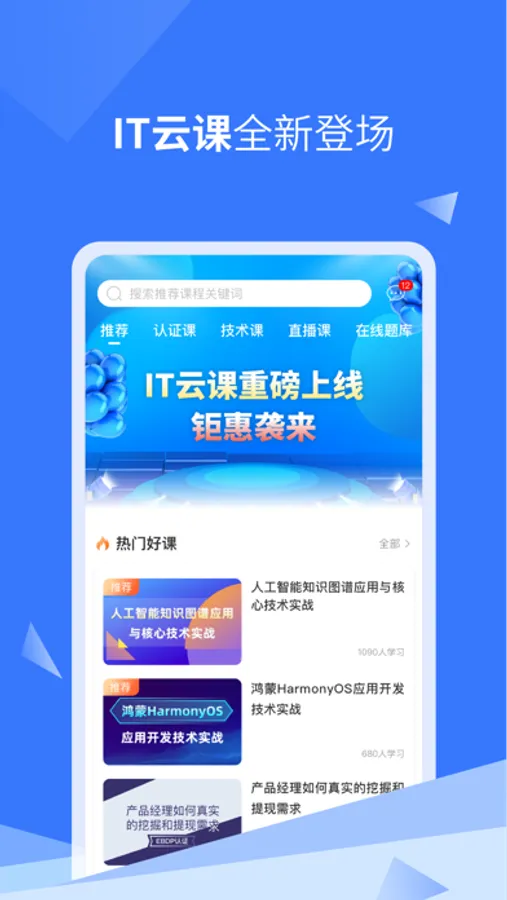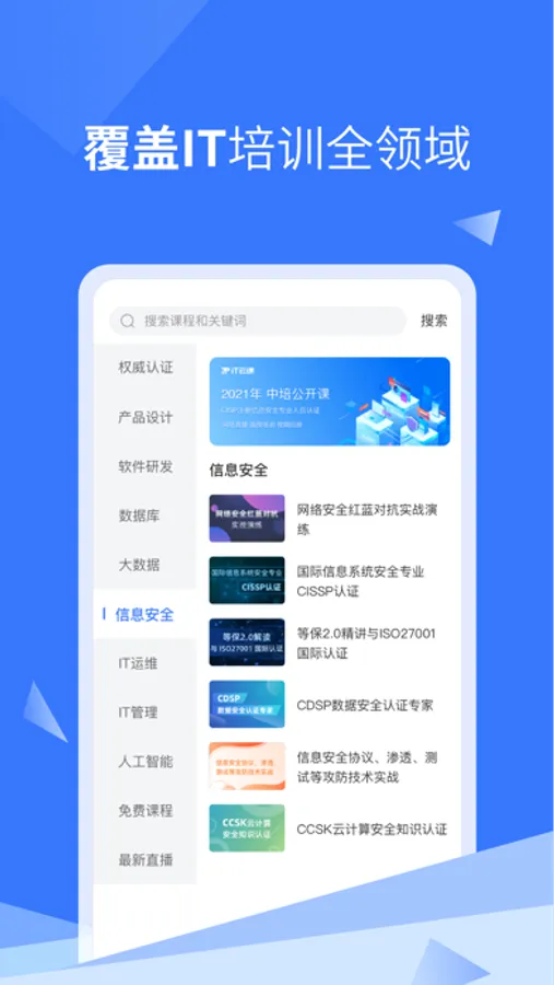 IT云课,课程包括,认证类:PMP、TOGAF、CDMP、CDGA、EBDP、CISP系列、CDSP、CCSK、CISSP、CISA、ISO27001、ITIL、NPDP、国家软考等IT认证类证书课程;最佳实践类:数据资产、数据中台、大数据分析、大数据挖掘、产品经理、5G、IT项目管理、微服务、敏捷测试、DevOps等;落地实战类:红蓝对抗、数据治理、Java、Vue、Html/CSS、JS、Jquery、Python、HarmonyOS、Linux、机器学习、知识图谱、人工智能等。