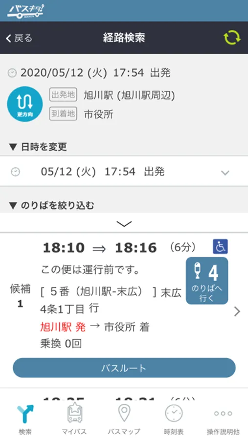 (4) 乗り継ぎ検索 :バス同士の乗り継ぎで最短の経路を検索することができます。