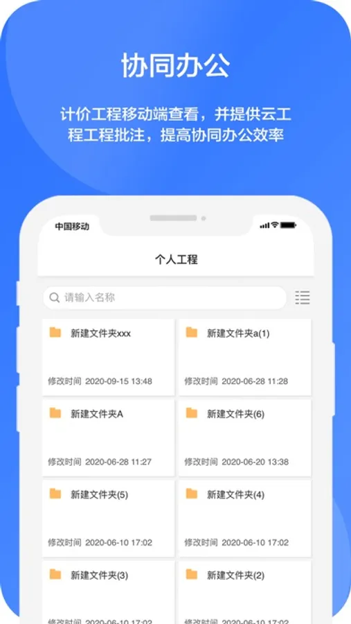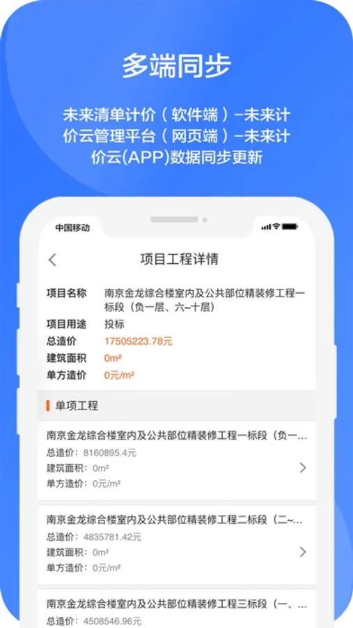 用户可以在未来计价云 APP 查看个人或者企业的计价工程数据。突破了时间和空间的限制,使您的工作场景不再受电脑的限制,只需一款手机就可以随时随地查看我的工程、企业共享工程详情,并且可以通过企业协作完成计价工程数据互通的协同办公移动工具。