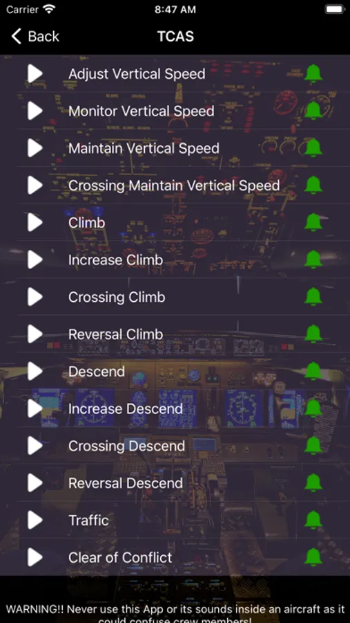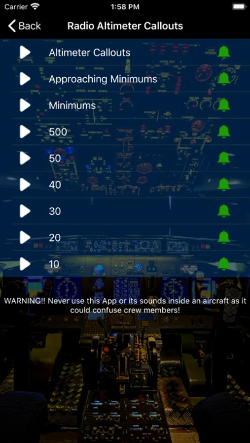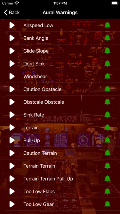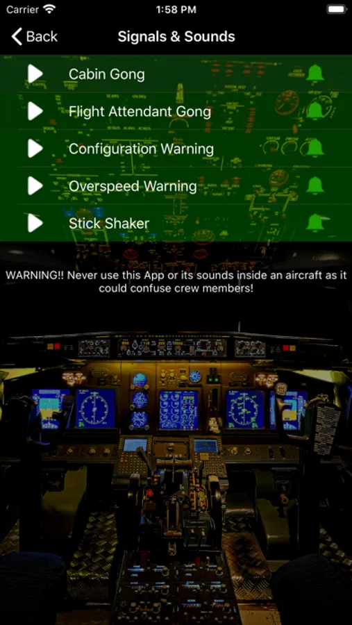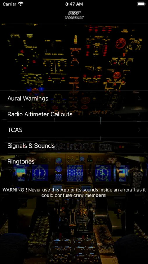 737-Voice enables the playback of original aural warnings such as "Terrain" or "Pull-Up" and using it as a ringtone (via iTunes or Apple Music). 737-Voice includes a description and video for installing ringtones.
