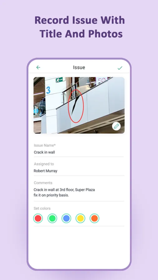 => Record issues with a photo, annotate it, assignee and comments.