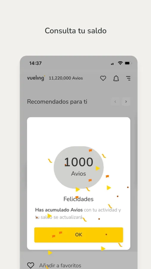 Acumula Avios cada vez que compres con tus marcas favoritas. Vueling Club Rewards es la forma más fácil e inteligente de obtener. Comida, moda, tecnología y hasta viajes, puedes acumular Avios con más de 100 marcas líderes en el mercado. Además, mantente actualizado con las últimas ofertas especiales y noticias de nuestros partners. Vayas donde vayas, puedes consultar tu saldo de Avios, tus transacciones recientes y ver como de cerca estás de tu próxima aventura.