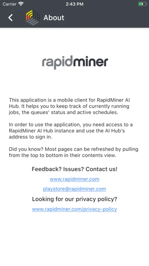 This application is a mobile client for your RapidMiner AI Hub instance.