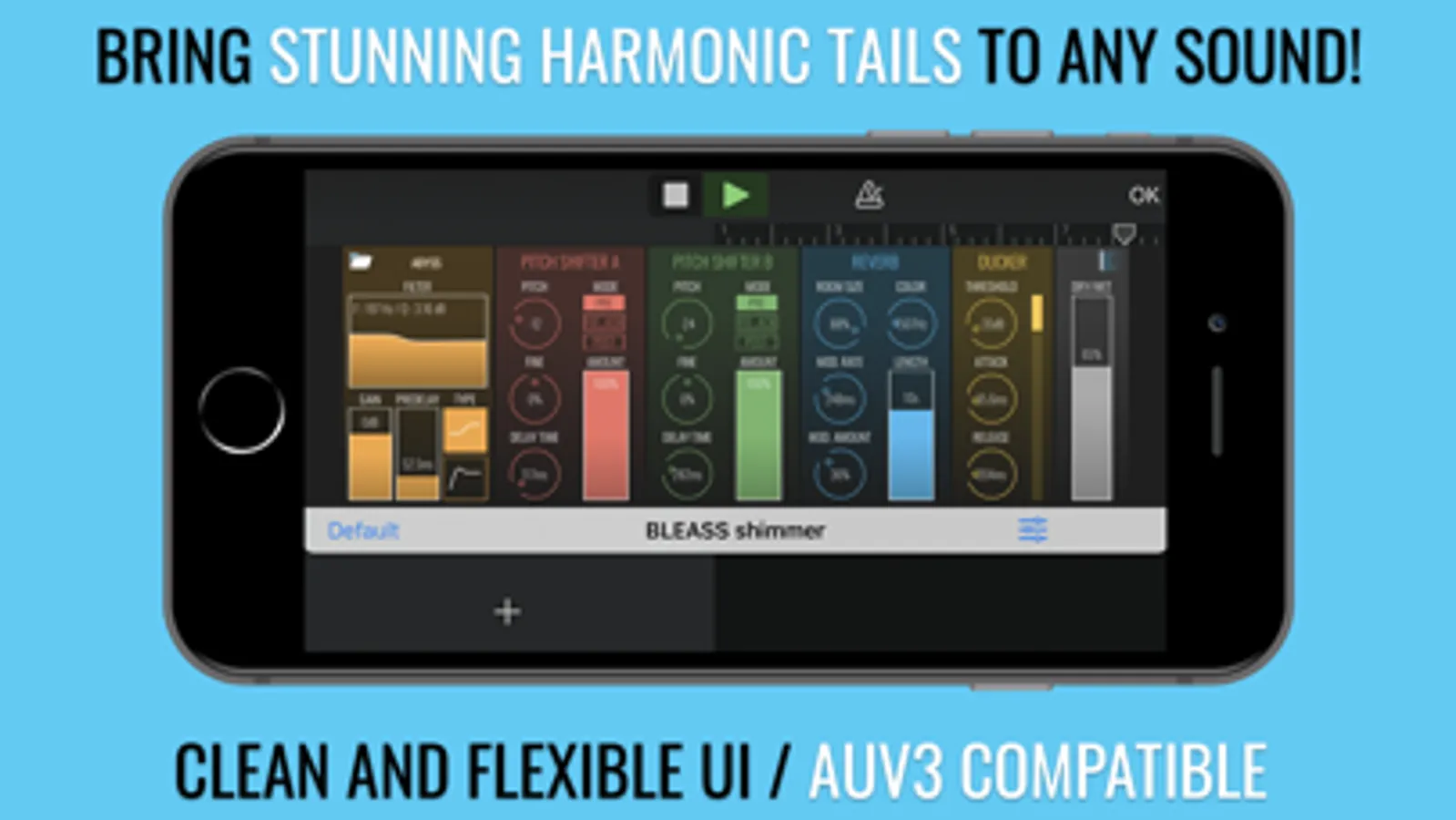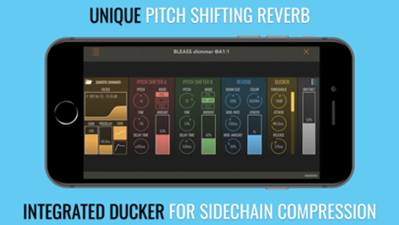 BLEASS Shimmer is an AUv3 compatible studio quality Shimmer Reverb Effect that brings stunning harmonic tails to any sound or instrument with very low CPU usage.