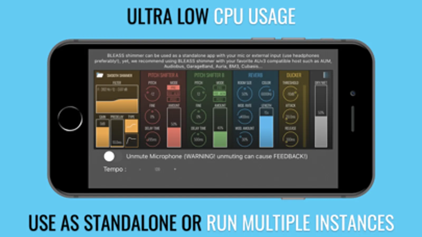 *NOTE: this is an Audio Unit Effect Plugin (AUv3) which requires a compatible host such as AUM, Audiobus, GarageBand, Cubasis, BM3 and Auria. You can also use the BLEASS Shimmer as a standalone app using headphones and mic or an external sound card.*
