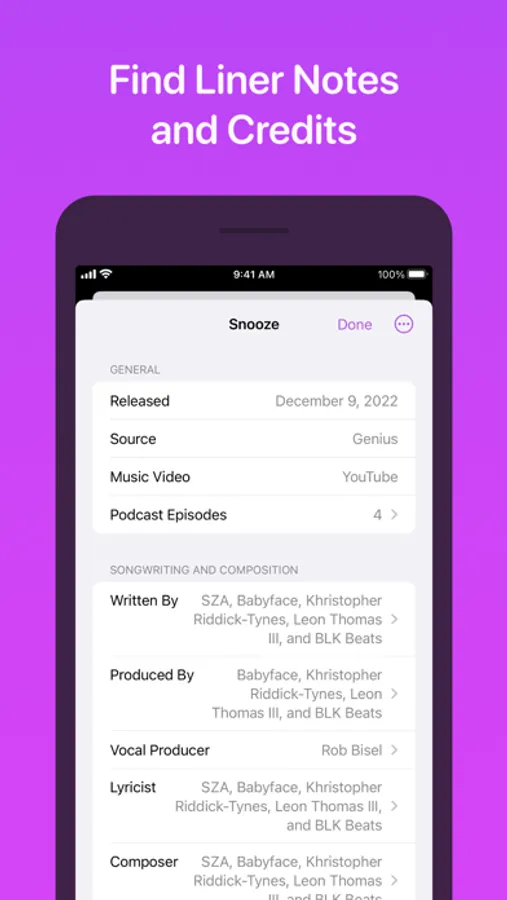 MusicSmart finds liner notes and credits for your albums, songs, and artists. Gain insights into the creative process behind your favorite music, discover the writers, producers, engineers, and other collaborators involved in the production, and more.