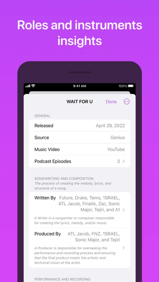Note: No Apple Music or Spotify subscription is required to use MusicSmart. MusicSmart relies on multiple online sources and databases to find liner notes and credits. The number of details available may vary for each song.