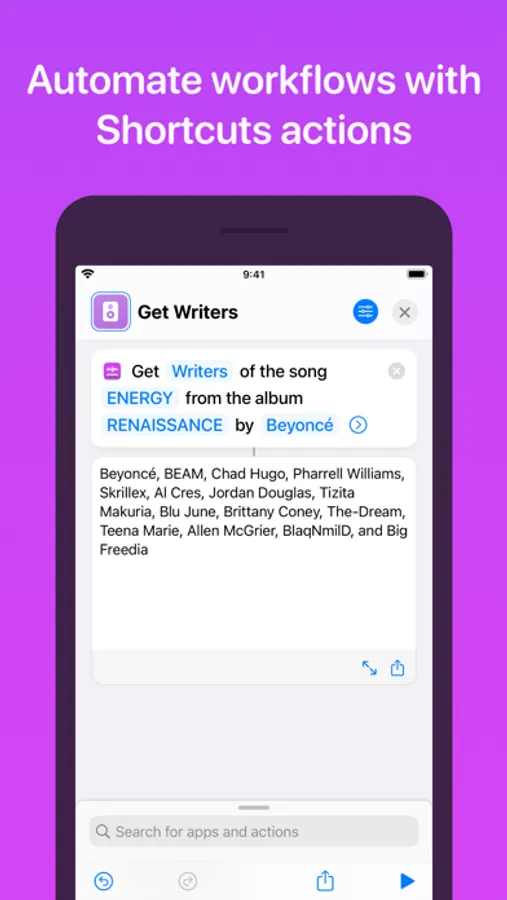 Navigate the catalog from within the main app or use a handy Action Extension from Music or Spotify to read the details about any song. Shazam is also available, so you can access liner notes and learn more about songs playing around you.