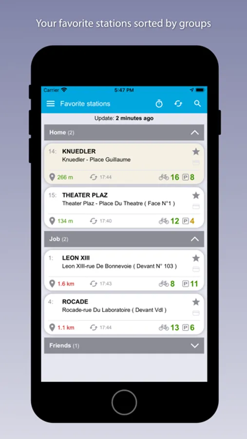 - List of favorite stations categorized by groups (home, work, friends or general).