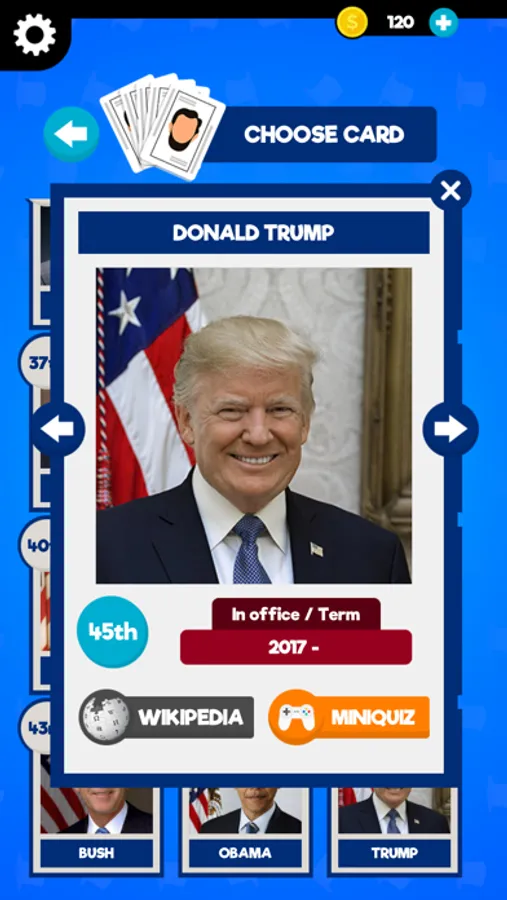 In this Learn Mode you can browse president cards and display important facts and even quiz yourself with a mini trivia about that person! And if you're hungry for knowledge and want to know even more, the app links to encyclopedia for the US president you are interested in!