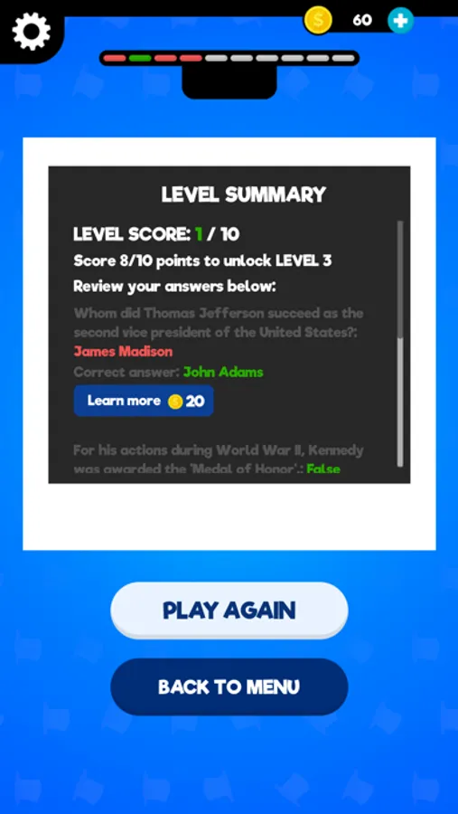 And finally, ◆ TRIVIA CHALLENGE ◆ is for the most curious American history fans out there. Lots of history questions and answers will surely put your knowledge to the test! And don't worry if you get something wrong - at the end of each round there's a Level Summary where you can review your answers and check the correct ones!