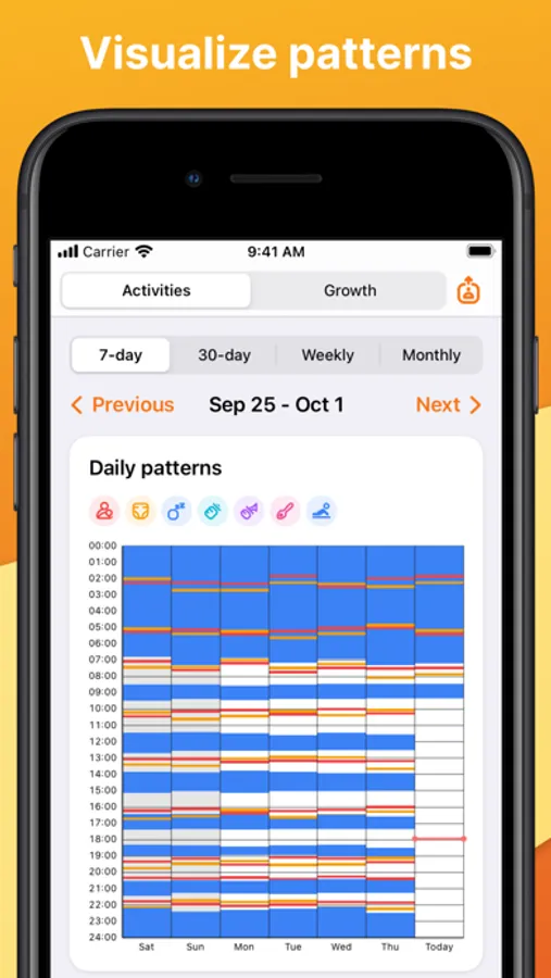 + Daily pattern charts: You can view daily pattern charts with color-coded activities to see how your baby's day is spent, making it easier to identify and understand their routine.