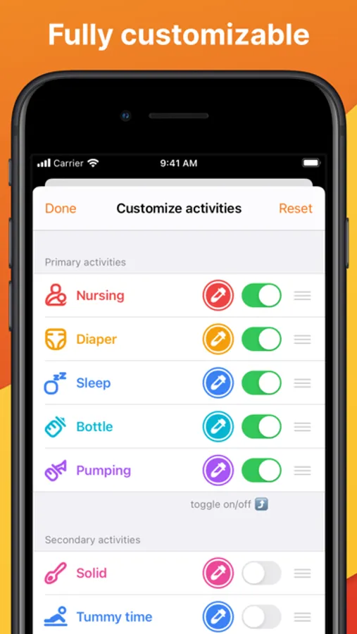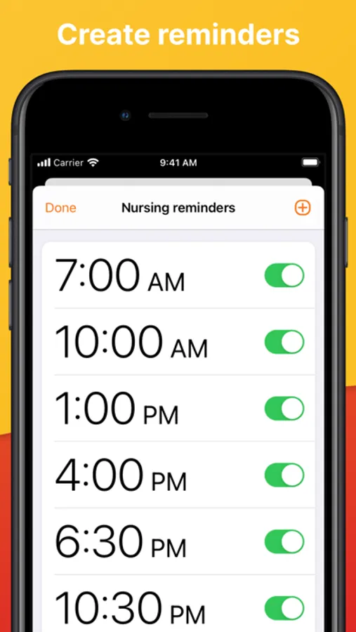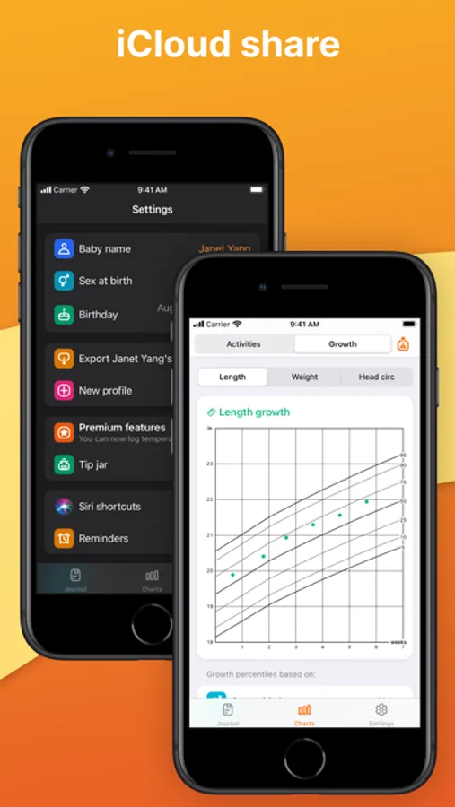 + iCloud share: Share your child's profiles with your partner or caregivers to log activities together without sharing a device or iCloud account.