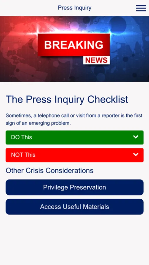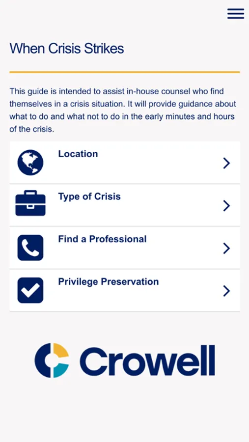 When crisis hits, businesses leaders across the globe turn to Crowell & Moring for advice on navigating government and internal investigations. Our Crisis Response App suite of easy-to-use checklists, sample forms and other critical information provides best practices for navigating the dos and don’ts of a crisis.