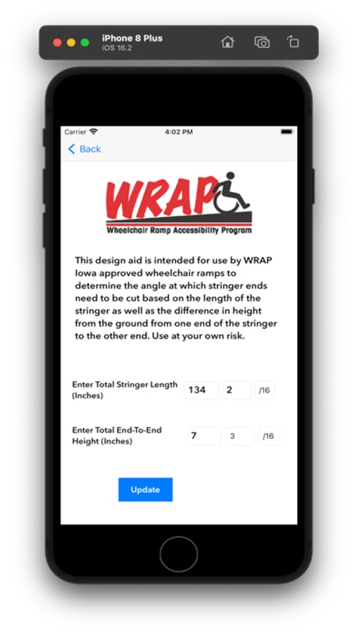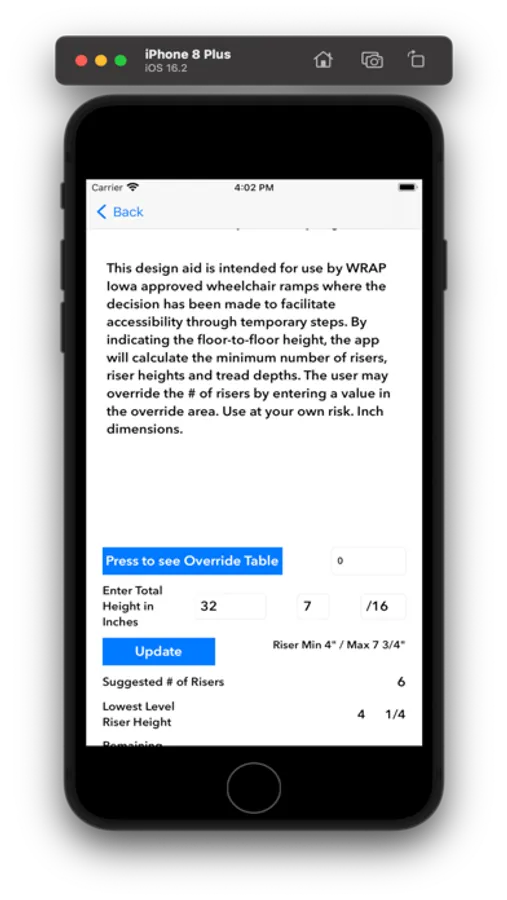 This app provides suggested measurements for stairs rise and run as well as for the suggested cut angle for wheelchair ramp stringers. The app also includes links to the WRAP Iowa website and to an excellent article on stair construction on the Fine Woodworking website.