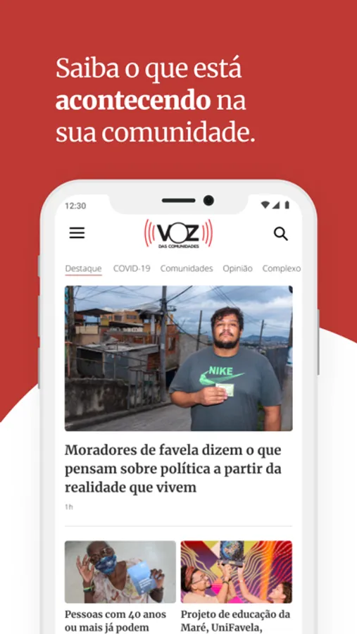 * Jornal: todo o conteúdo do jornal do Voz das Comunidades é fácil de acessar, ler, salvar e compartilhar