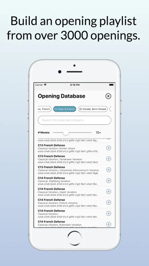 Create an opening playlist from over 3000 opening lines and practice against the computer to expand your repertoire.