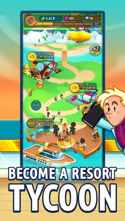 It’s as simple as one tap to start building your Resort Empire. Guests arrive in style, in a YACHT, then start tapping your way to the top!