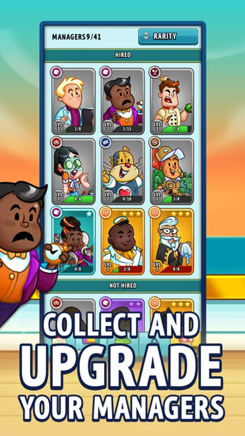 Earn and collect different Resort Managers to help build the perfect paradise! Each Manager is equipped with unique abilities! Promote your Managers to increase your money making abilities so that you can relax and focus on building to become a Vacation Tycoon!