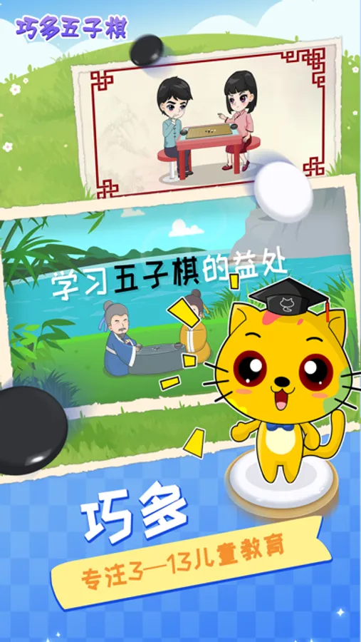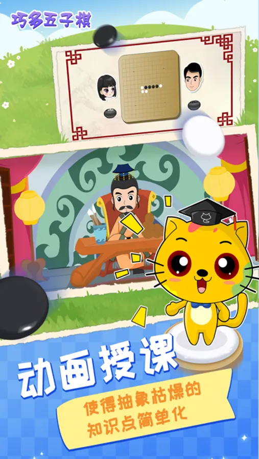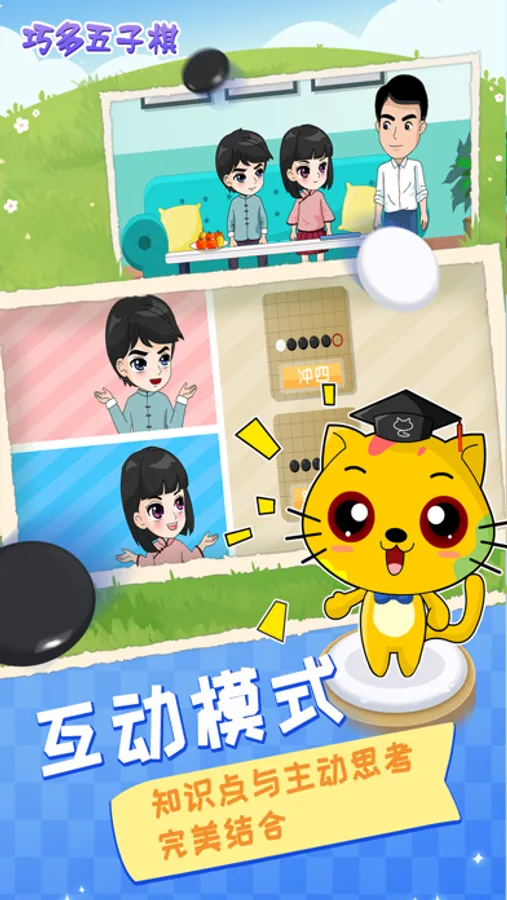 教学内容采用人物互动方式来展开,生活化的对话结合动画的表达形式,亲切自然,使得抽象枯燥的五子棋知识润物细无声的被孩子不知不觉就接受和了解。