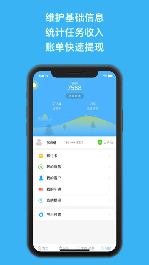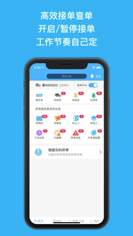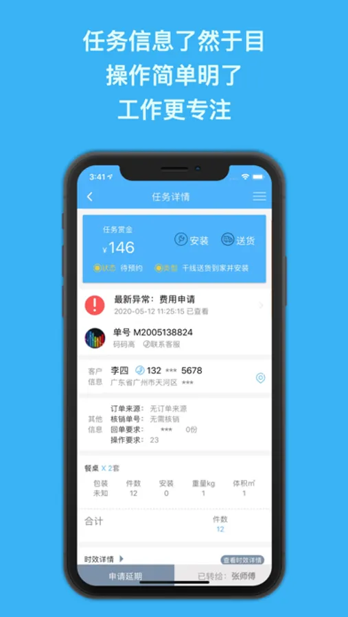 本APP用于家具配送安装领域,提供给家具配送安装从业人员使用,内置运输配送、家具安装、家具维修、异常处理、服务费统计、服务费申请等功能。