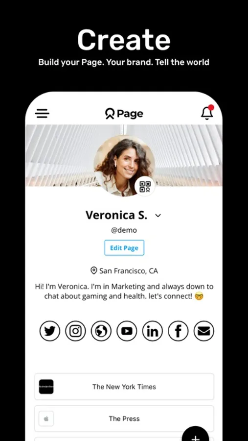 Share your phone number, email, social network profiles and web pages with a QR code, Page virtual card or location for an easy connect