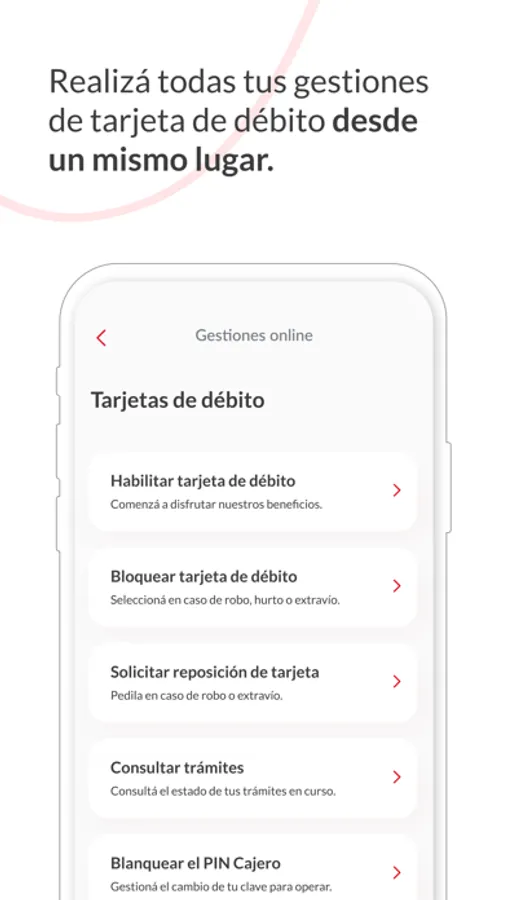 Realizar todas tus gestiones de tarjeta de débito desde un mismo lugar.