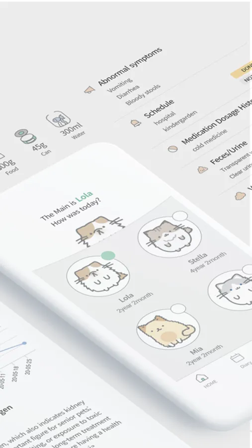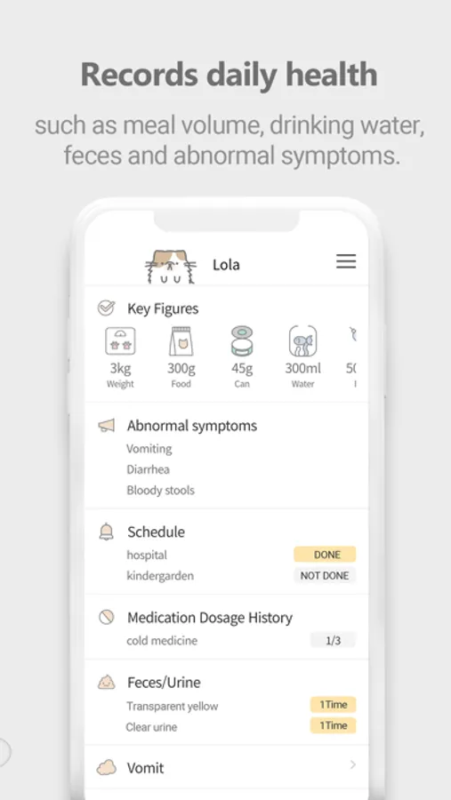 - Records daily health such as meal volume, drinking water, faeces and abnormal symptoms.