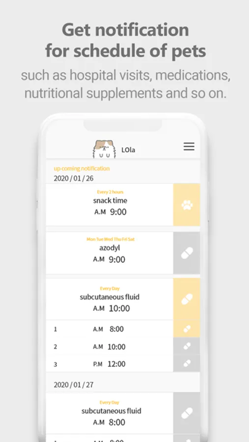 - get notification for schedule of pets such as hospital visits, medications, nutritional supplements and so on.