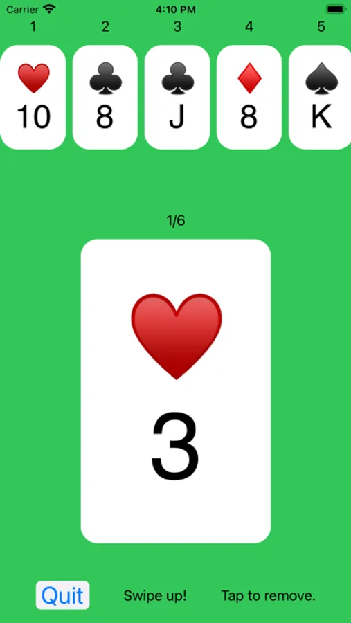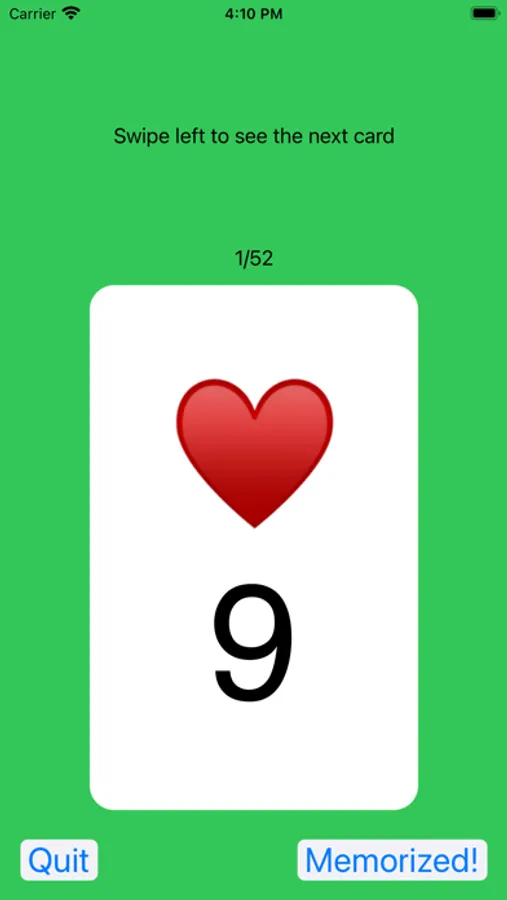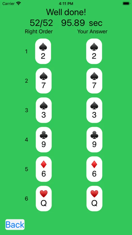 MemDeck shuffles a deck of cards and shows you the order. You see the cards to memorize the order. The app records how long do you take to memorize the cards and automatically checks your answer. The results are recorded and you can check them later.