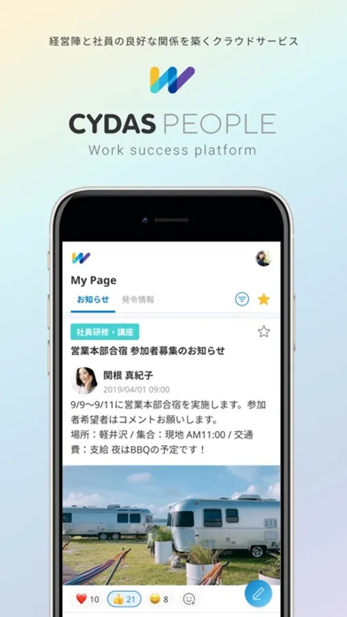 CYDAS PEOPLEは、経営・人事・社員の良好な関係を築くクラウドサービスです。新しい働き方が求められている、現代のニーズに応える機能を搭載しています。会社と社員の成長をサポートして 「働きがい」を生み出します。