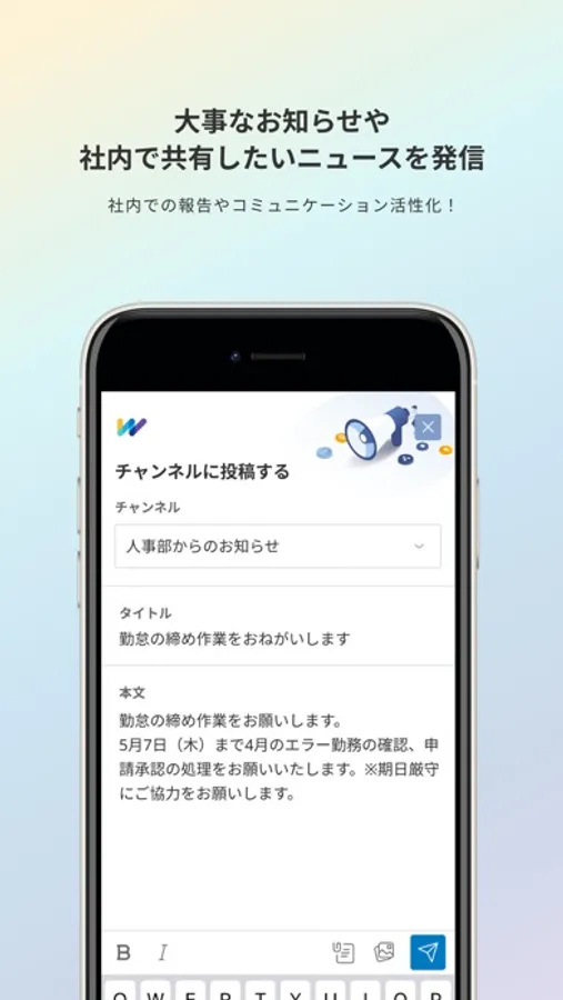 社員自身が様々な情報をいつでも確認、登録できます。チャンネル機能を活用して、会社から社員全体へのお知らせをしたり、部門イベントの告知などを投稿してみましょう。経営・人事・社員とのつながりを深めるきっかけになるはずです。