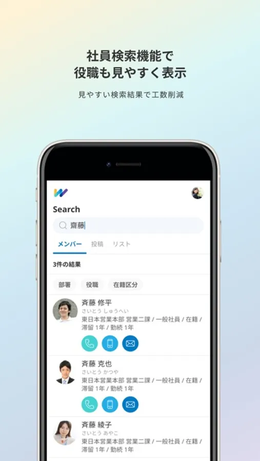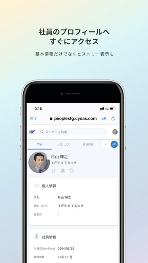 メンバーの所属や社内連絡先、社内経歴、チームメンバーなどの情報をひと目で確認できます。プロフィールを見れば、仕事で関わりのあるメンバーや、異動先のメンバーについてもっとよく知ることができます。