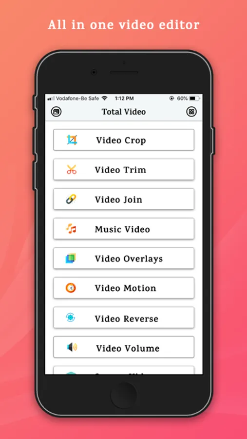 This app support video crop, video trim, video join, add music to video, video overlays, video reverse, video motion, video volume, square video and get music from video features.