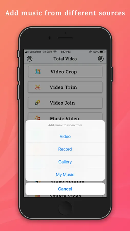 • Add music from different sources like iPhone music library, music from video and record voice.