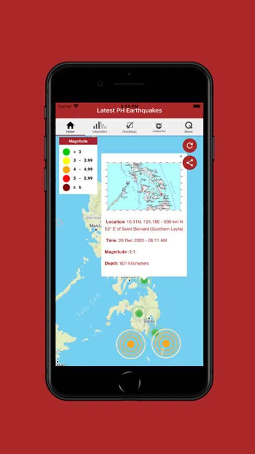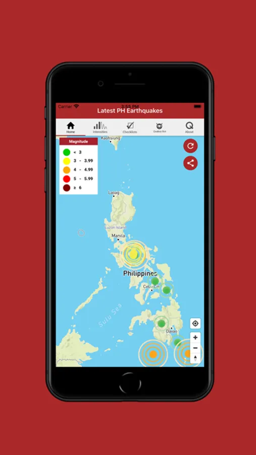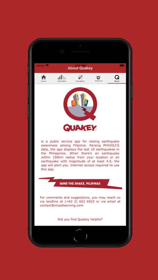 Quakey monitors earthquakes in the Philippines by parsing PHILVOCS and USGS data and visualizing them. An earthquake within your 300 km radius or one with a magnitude greater than 4 triggers an alert. Quakey also enables you to share your exact location with friends, family, and contacts. Internet access is required to use this app.