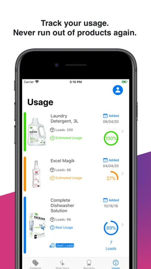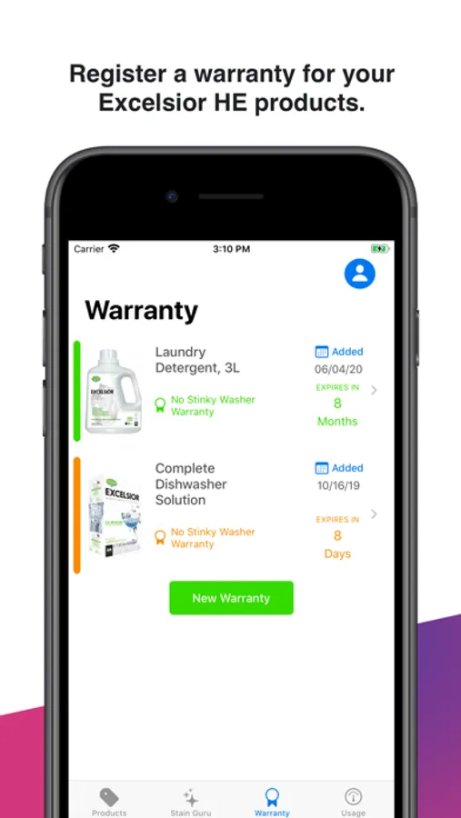 Purchased a new washer and Excelsior detergent at the same time from a retail store? Our app makes it easy for you to register your new purchases for the exclusive “No Stinky Washer Warranty”* as well as keep track of when you’ll need to re-purchase your detergent to maintain your warranty. You can also track your 30 day Love it / Adore it satisfaction guarantee.