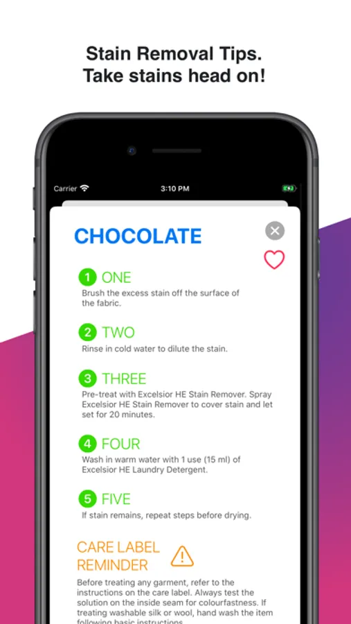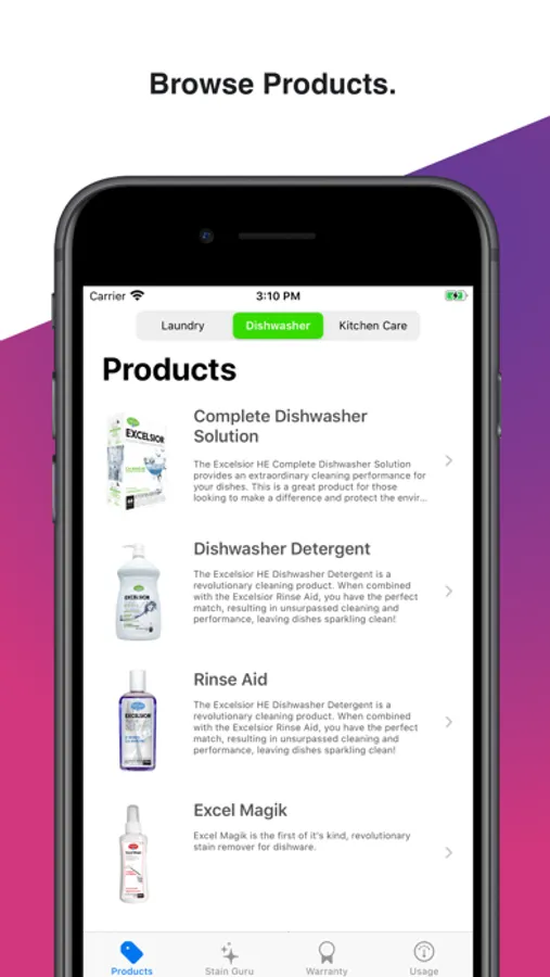 Make life easy and convenient with Excelsior HE – why? Because you love what it does for you. This app was designed to help track your Excelsior product usage, warranties, and get great stain removal tips all in one place.