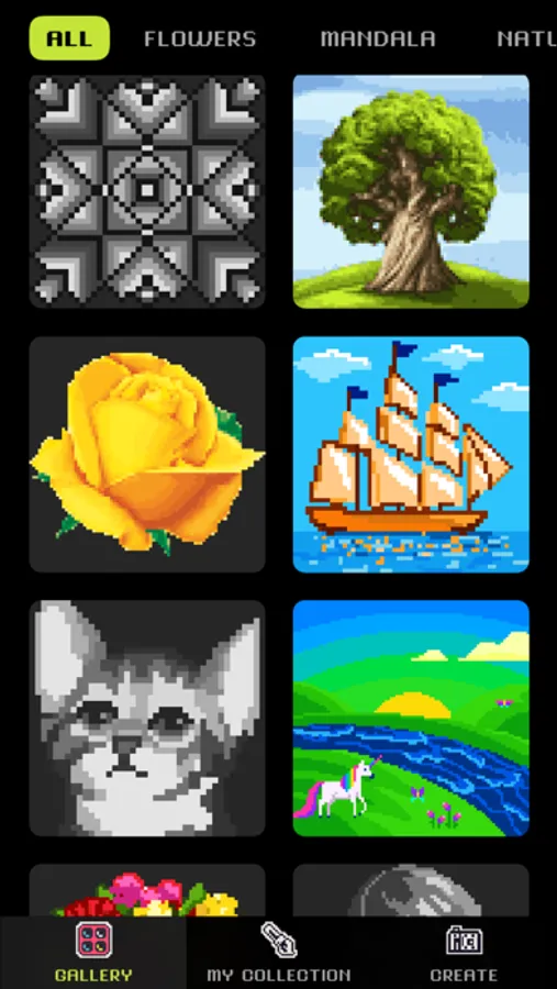 Keep your head and hands busy with Pixel Gallery, a great collection of color by number puzzles for adults. Enjoy a new take on pixel art coloring, with challenging artworks and bright colors on dark canvas.