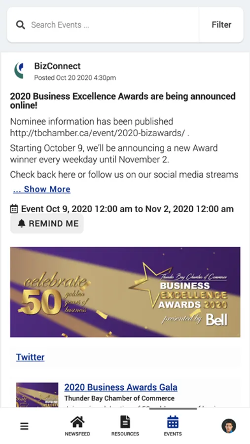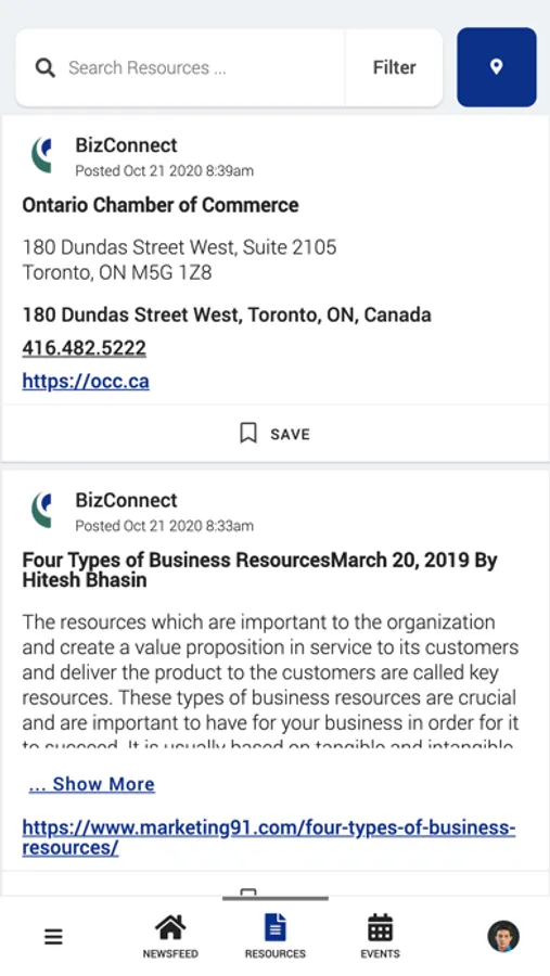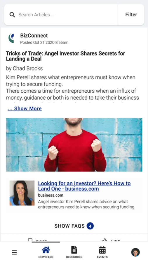 BizConnect connects users with a newsfeed, resource, and event tabs with posts relating to personal growth, business strategies, mental health, wellness, culture, and belonging.